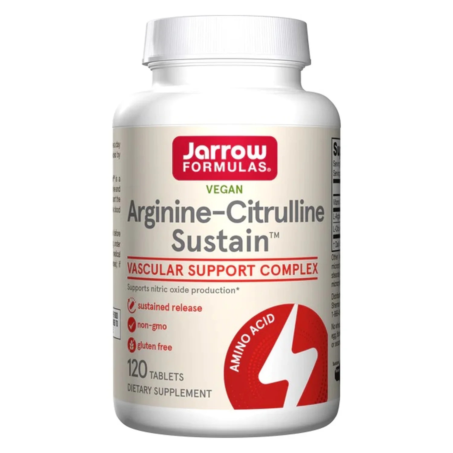 Jarrow Formulas Arginine-Citrulline Sustain is a synergistic combination of two amino acids to support nitric oxide (NO) production, blood flow and cardiovascular health. L-Citrulline largely converts to L-Arginine, increasing circulating and blood vessel levels of L-Arginine for NO production. Arginine-Citrulline Sustain provides these amino acids to the body over an 8 hour period.
