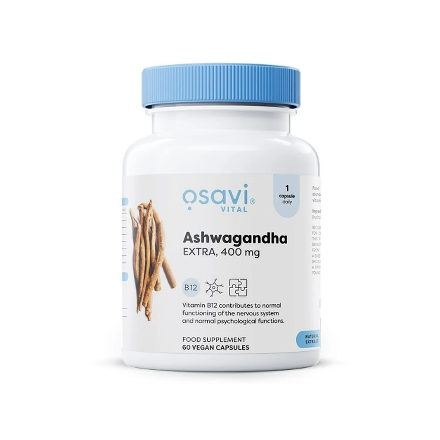 One capsule contains 400mg of standardised ashwagandha root extract (Withania somnifera), standardised for min. 2.5% of withanolides and 100μg of vitamin B12 in the active form – methylcobalamin. The daily dose provides as much as 10 mg of withanolides. The combination of ashwagandha with vitamin B12 is the support that people living under stress and tension need to support their ability to relax and regain vitality.