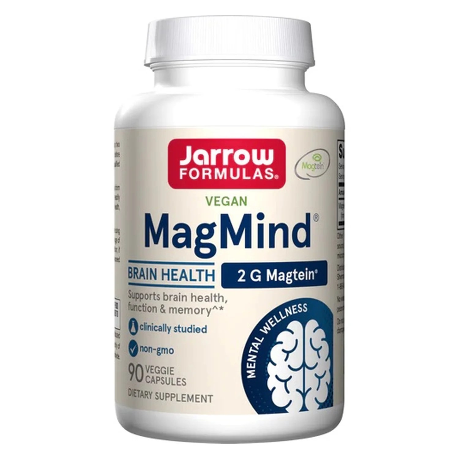 Jarrow Formulas MagMind, featuring Magtein, is a form of magnesium from Magnesium L-Threonate that readily crosses the blood-brain barrier and supports brain health, function, and memory in healthy adults.