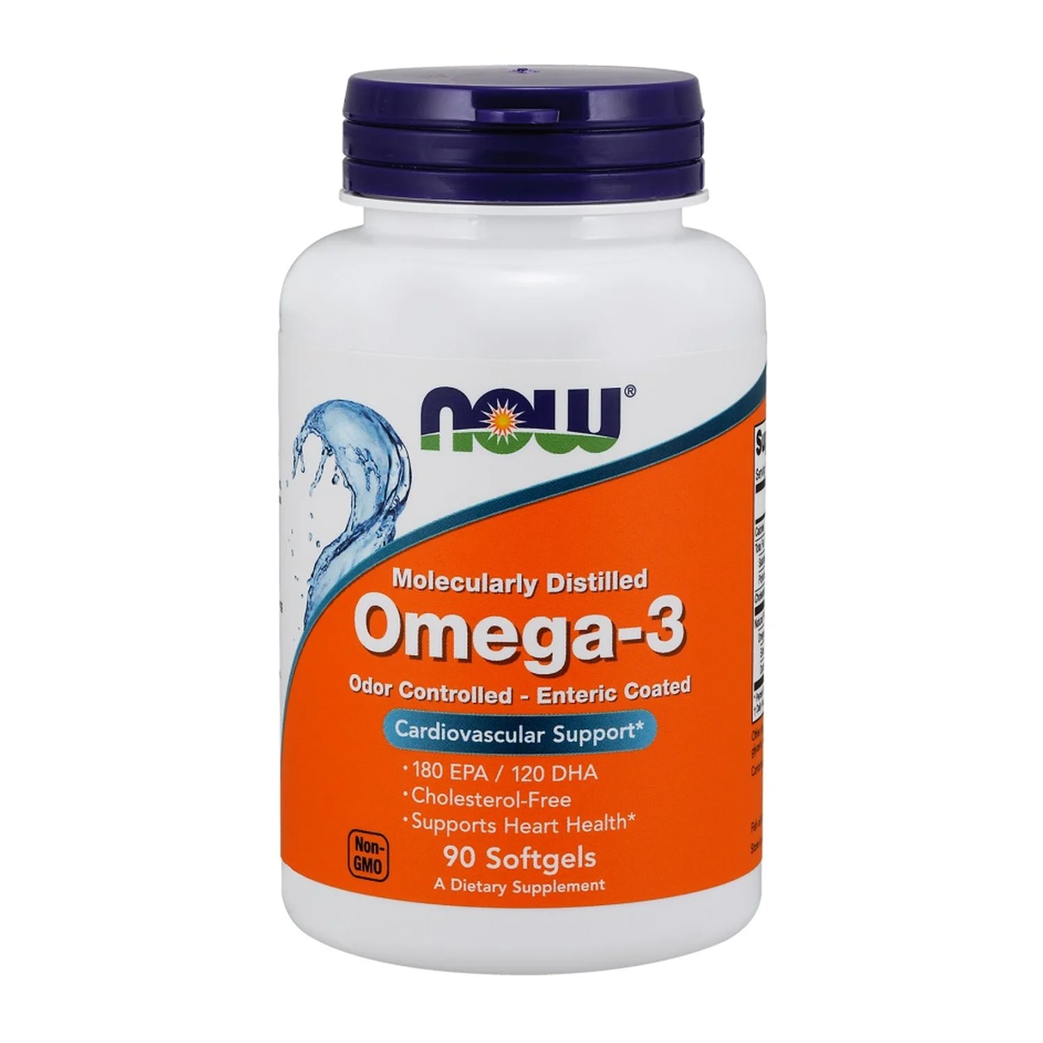 NOW Foods molecularly distilled omega-3 fish oil with enteric coating for heart health.