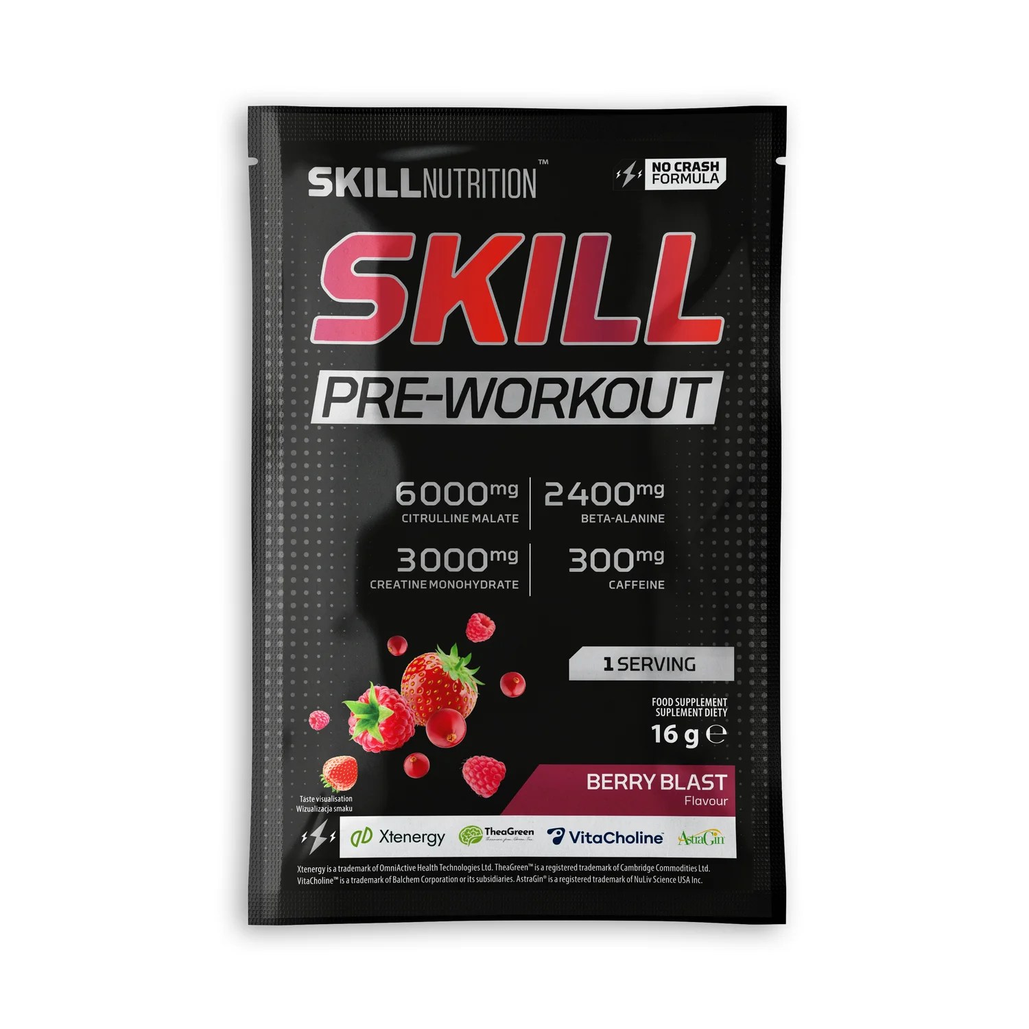 Take your workout to the next level with Skill Pre-workout in the sweet-and-refreshing Berry Blast flavour. Designed for athletes who demand peak performance during high-intensity workouts. Experience sustained energy without the crash, thanks to our unique no-crash formula featuring Xtenergy®, TheaGreenTM, Vitacholine® and Astragin®.