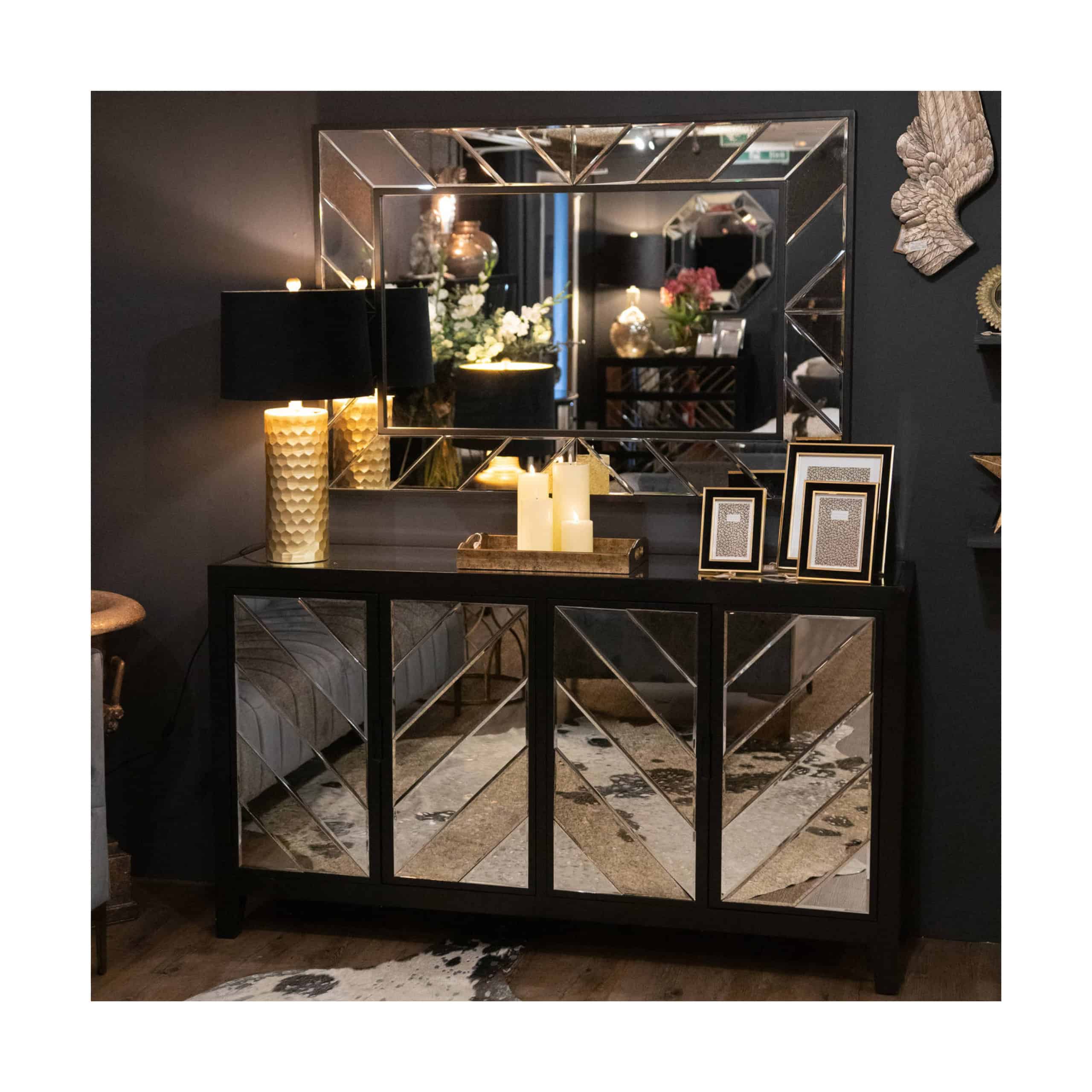This is the Soho Black Mirror Collection Large Mirror. Exclusively designed and manufactured, this item forms part of a collection which takes our mirrored furniture offering to new heights of style and modernity. Utilising black painted pine and a combination of clear and antique mirror, this item’s striking chevron pattern gives it a real wow-factor, perfect for its intended role above a matching sideboard or cabinet, as a room’s stand-out statement piece. We recommend hanging this item above other items from this collection to give each their full effect.